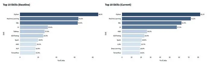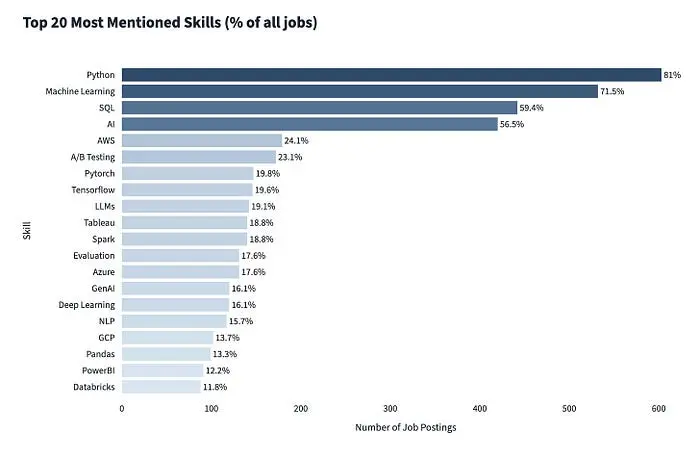 查看所有数据科学职位发布中最常提及的技能,基础知识保持稳定:Python、机器学习和 SQL 仍然占据主导地位。