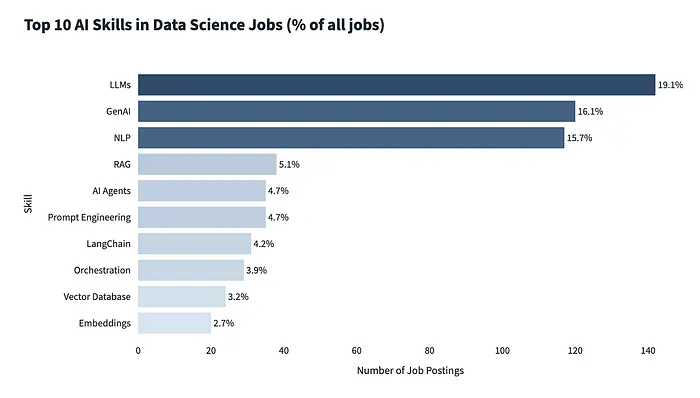 - 数据科学家需要 AI 技能吗? 是的,约 60% 的职位发布期望 AI 能力,无论是广泛的还是通过 LLMs、RAG 和 AI 代理等特定技能。