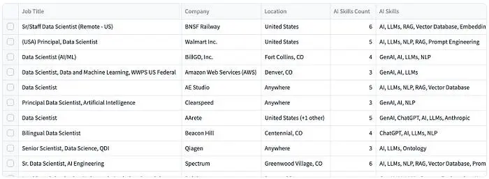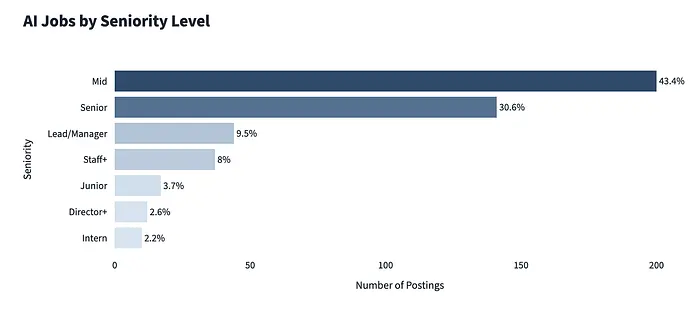 大多数以 AI 为重点的职位发布针对中高级数据科学家,这加强了公司期望经验丰富的从业者将 AI 能力转化为实际系统和业务成果的想法。