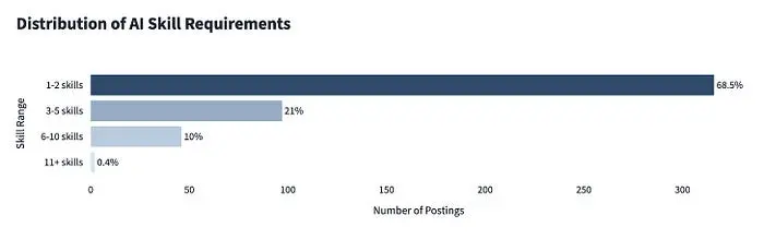 AI 技能要求的分布显示了公司如何看待 AI 能力的分歧。许多角色仍然要求少数广泛定义的 AI 技能,但很大一部分现在需要跨越多个具体领域的经验,如 LLMs、RAG、提示工程和向量数据库。