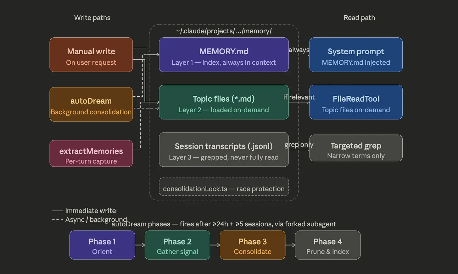 autoDream 在具有有限工具访问权限的分叉子智能体中进行整合、去重和消除内存中的矛盾,这可以防止它在运行时破坏主上下文。内存被视为提示,而不是真相。智能体在使用前会验证。