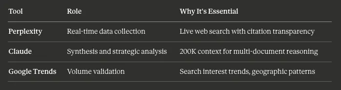 我尝试过单一工具方法。它不起作用。Claude 的知识截止日期*(2025 年 5 月)*意味着定价数据通常是几个月前的。上周的功能公告在其训练中不存在。搜索量数据需要专业工具。
