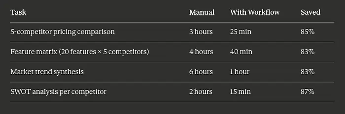 结果: 竞争分析从 3 小时缩短到 25 分钟。市场趋势综合从 6 小时缩短到 1 小时。研究保持最新,因为我可以在需要时重新运行工作流以获取新数据。