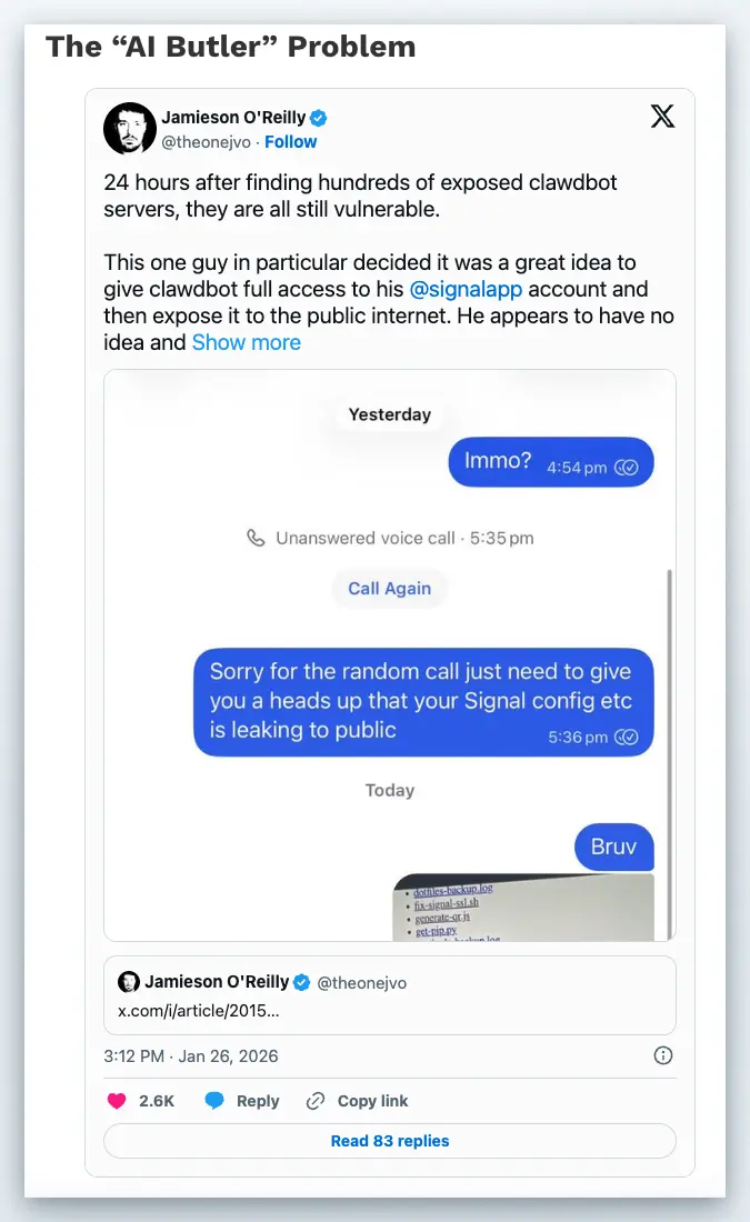 让这深刻地理解一下。某人的个人 AI 助手(那个知道他们日历、阅读他们邮件、管理智能家庭的助手)正以 root 权限运行,并且没有**认证。任何有网络浏览器的人都可以完全控制它。