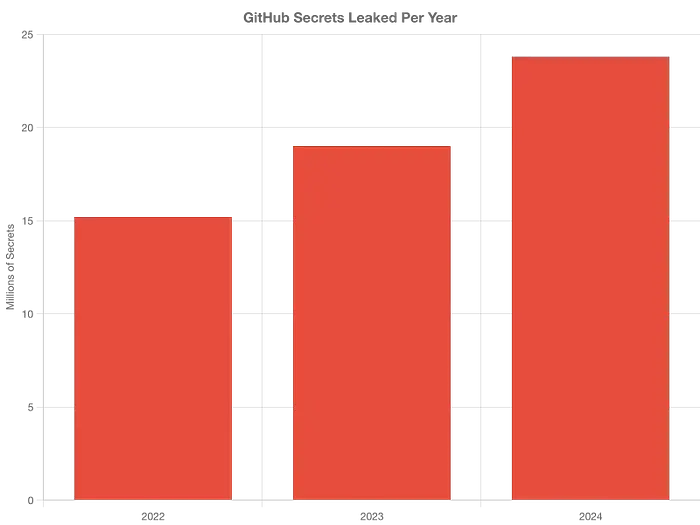 2024 年,研究人员发现 2380 万个秘密在 GitHub 上泄露,同比增长 25%。2025 年 1 月的 DeepSeek 数据库泄露泄露了超过一百万个日志条目,包括 API 密钥。Rabbit R1 出厂时在设备固件中硬编码了 OpenAI 和 ElevenLabs 密钥。