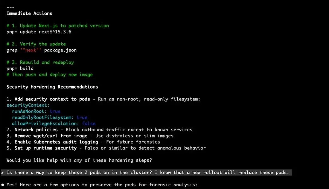 我们还对被破坏的 Pod 进行了取证分析,旋转了密钥,并添加了适当的安全上下文以防止未来的 wget 冒险。