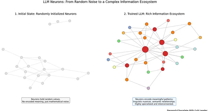 在其核心,神经网络是巨大的相互连接的神经元集合,每个神经元都包含决定其行为的数值(权重)。最初,这些权重是随机设置的——没有编码意义,没有存储知识,只有数学噪音。