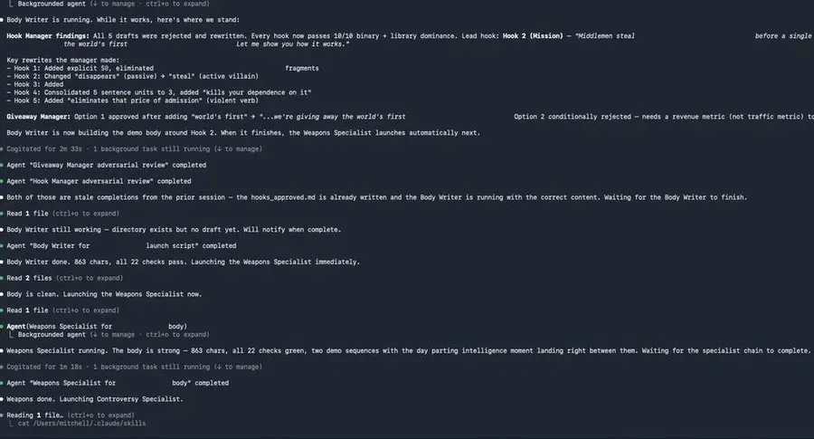 每个代理都独立运行在 Claude Code 的上下文窗口中,专注于某一方面,并达到各自的质量标准。我们只需提供品牌名称和产品简介,然后就可以离开,回来后就能看到一份完整的、可直接用于制作的脚本文档。