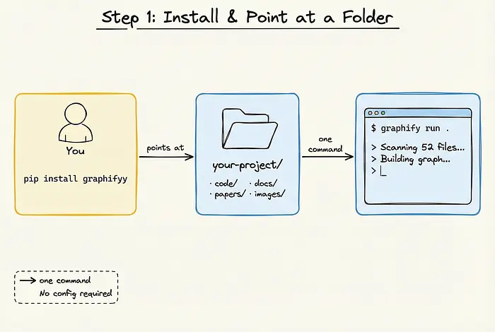 开始使用Graphify不需要任何配置。它不是向量数据库的包装器,也不需要你设置复杂的嵌入管道。