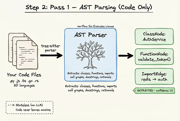 Graphify管道的第1遍完全是确定性的,在本地机器上运行。在这个阶段,没有任何代码被发送到任何LLM API。
