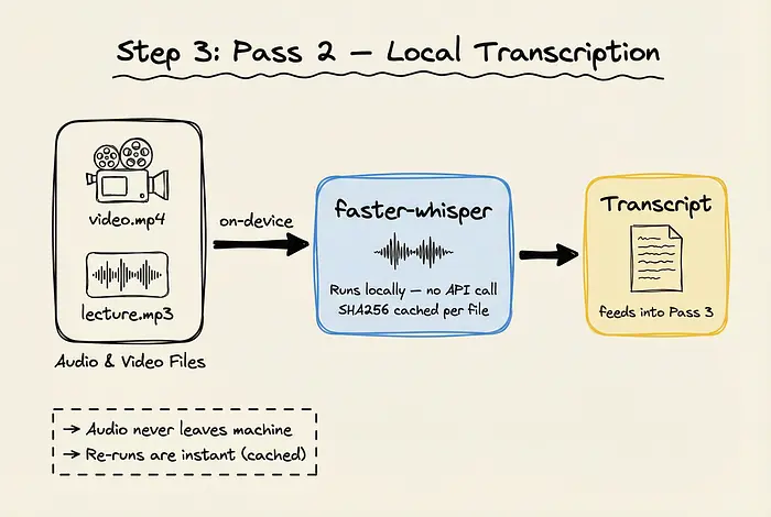 使用faster-whisper,Graphify直接在设备上转录这些媒体文件。音频永远不会离开你的机器。此外,转录本被SHA256缓存,这意味着如果你再次运行Graphify,转录步骤是即时的,除非媒体文件发生了变化。然后这些转录本被送入最终的提取遍。