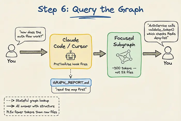 Graphify带有一个PreToolUse钩子。当你问助手"认证流程如何工作?"这样的问题时,钩子在助手开始在原始文件中grep之前触发。助手首先读取图谱映射,识别相关节点,并检索一个聚焦的子图。