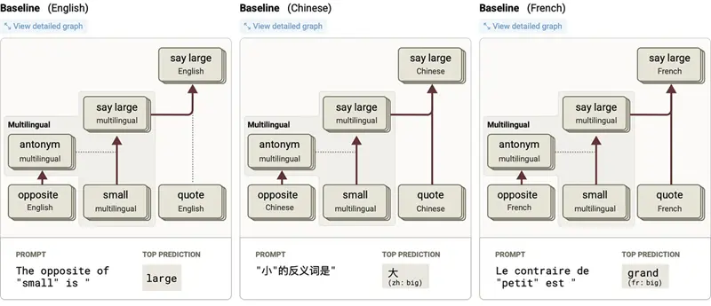 每个的高层故事都是一样的:模型使用与语言无关的表示,认识到它被问的是 'small' 的反义词。这触发了反义词特征,它介导了从 small 到 large 的映射。