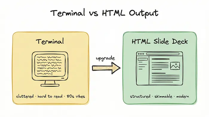 通过在你的提示词中附加"将你的工作呈现为一个单一的HTML幻灯片演示",你会获得一种更愉悦的信息消费方式。它让你可以轻松跳过不相关的部分,专注于重要内容。当我们拥有现代Web技术时,没有理由回到80年代。