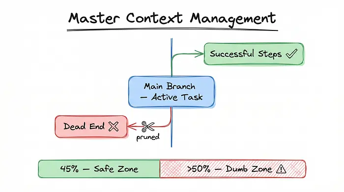 上下文就是一切。每一个岔路、每一次争论、每一个死胡同都会消耗你的token和智能。一旦你的上下文窗口超过50-60%的标记,代理就会进入Meyer所说的 "愚蠢区域"——其输出质量会明显下降。