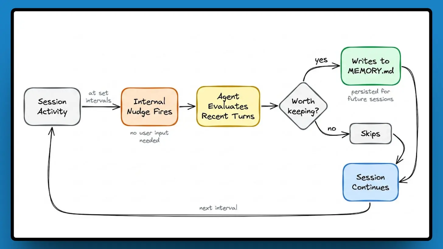 在会话期间的设定间隔,Agent 会收到一个内部系统级提示,要求它回顾发生的事情并评估是否有任何内容值得持久化到内存中。这会在没有用户输入的情况下触发,Agent 会扫描最近的活动,如果有任何内容跨越了在未来会话中有用的阈值,就会将其写入内存文件。