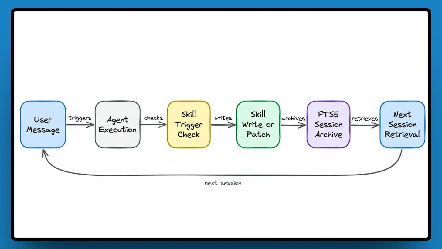 当 Agent 完成任务时,它会检查所采取的路径是否值得记录。触发条件是具体的:五次或更多工具调用、从错误中恢复、用户纠正,或者奏效的非明显工作流。