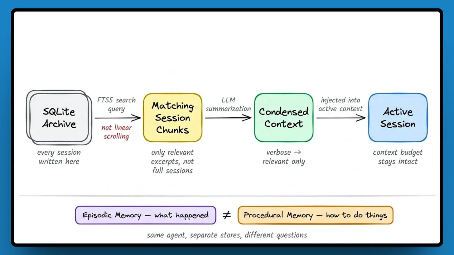 每个会话都会被写入 SQLite 存档,并使用 FTS5 进行索引,因此 Agent 可以搜索过去的上下文,而不是将整个旧会话加载到窗口中。检索到的结果在注入之前会经过 LLM 摘要处理,因此只有与当前任务相关的内容才会被引入。