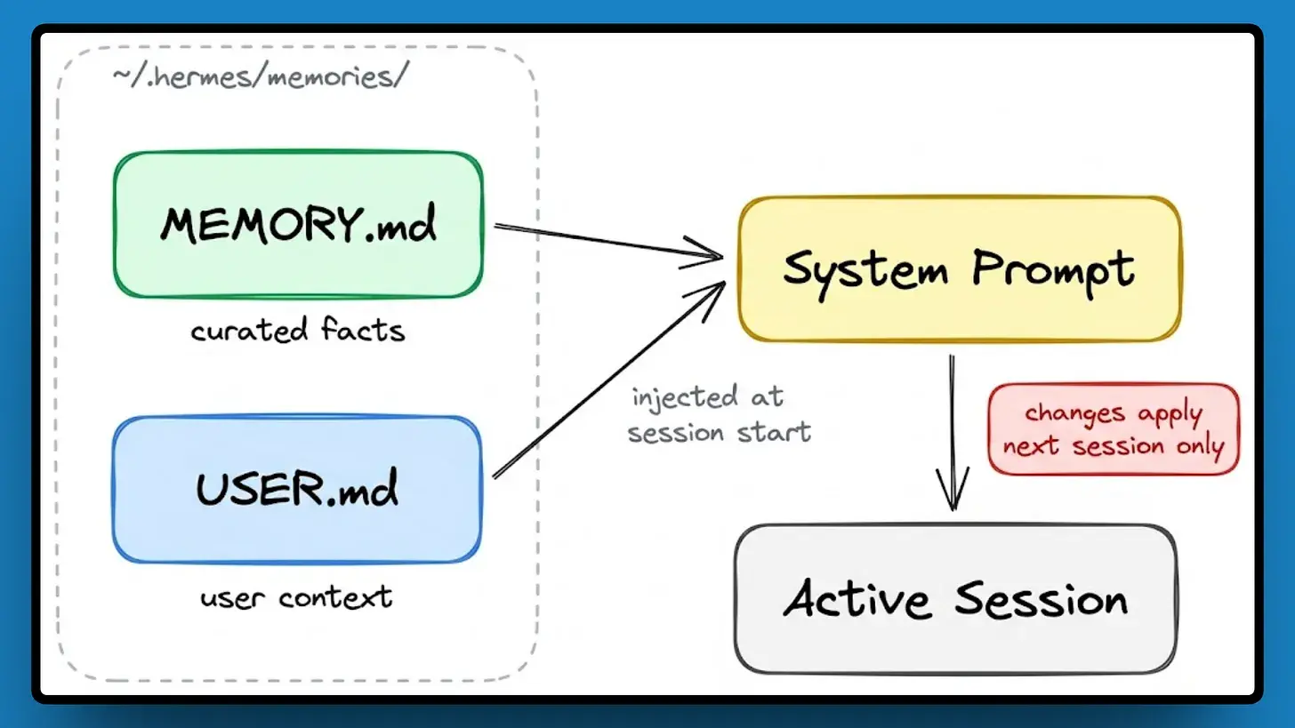 一个重要细节:在会话期间对 MEMORY.md 或 USER.md 的编辑只在下一个会话生效,而不是在对话中间。