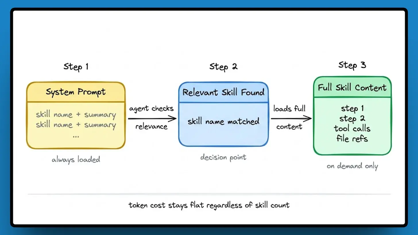 这使得无论存在多少技能,Token 使用量都保持平稳。拥有 200 个技能的 Agent 与拥有 40 个技能的 Agent 的上下文成本大致相同,因为详细内容只在实际需要时才会进入上下文。