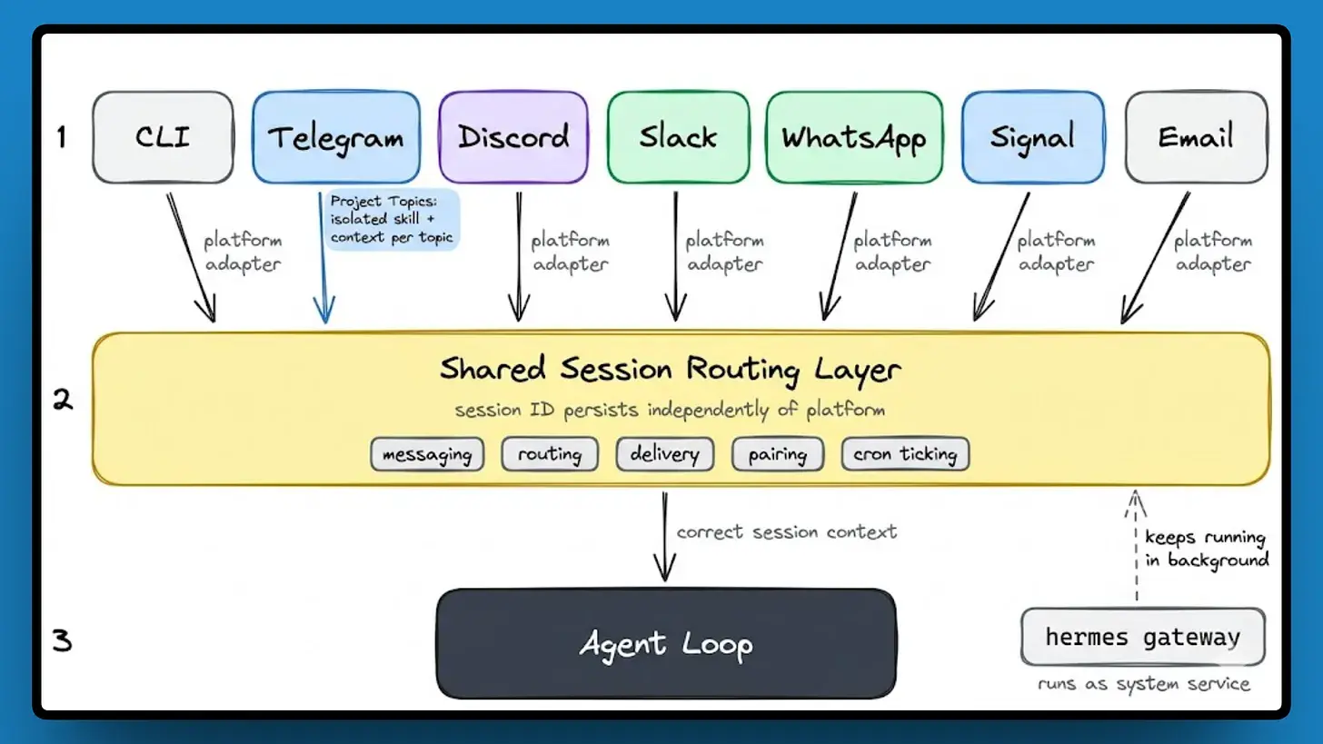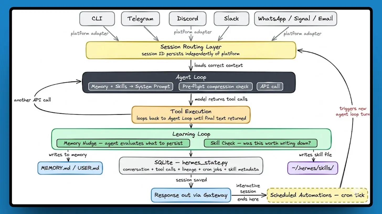 在 Hermes 中,网关是同一个循环的一部分。传入的消息可以触发技能创建,定时自动化通过相同的网关层写回输出,跨平台连续性之所以有效,是因为会话路由是接入系统的,而不是单独附加的。
