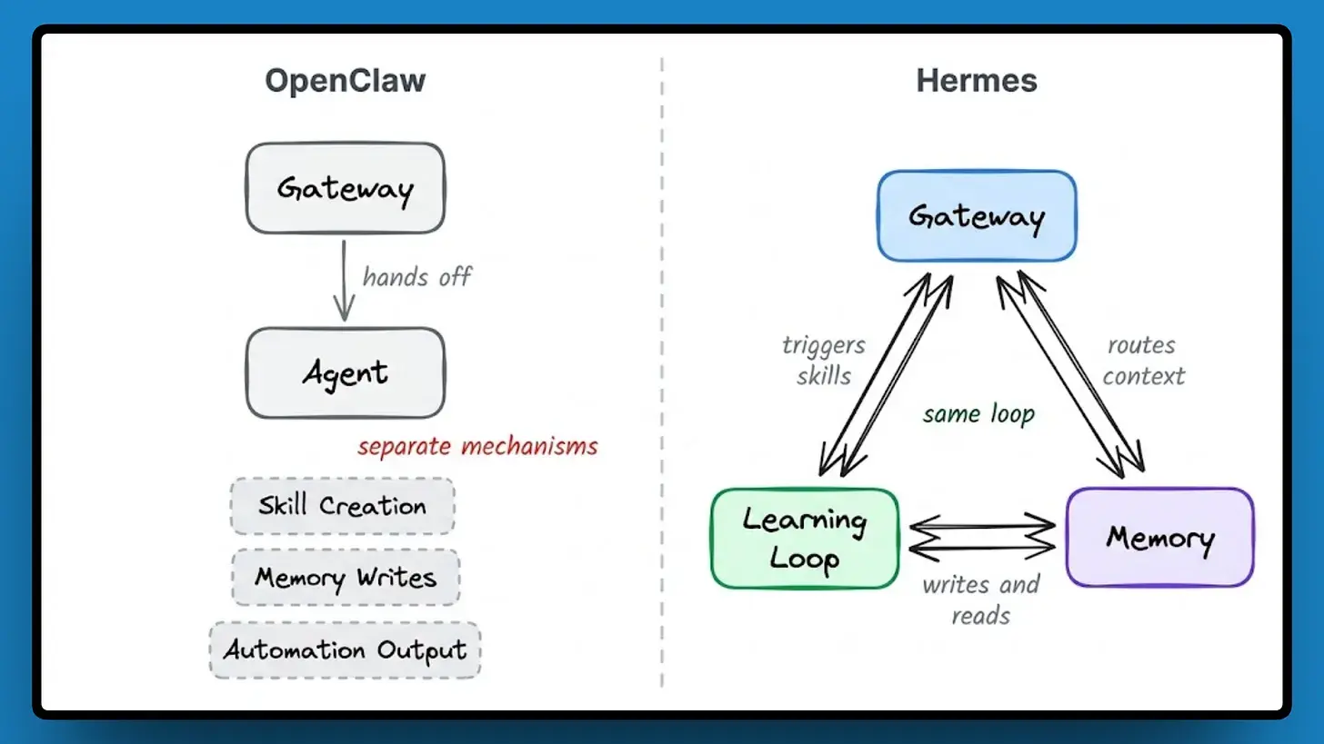 像 OpenClaw 这样的 Agent 会在会话之间保持上下文,并通过中央枢纽进行路由,这对于简单用例很有效,但在存储发生了什么和存储什么方法有效之间存在一个差距。Hermes 正是围绕这个差距设计的,已完成的工作流会被转化为可复用的流程,Agent 下次可以直接遵循,无需重复相同的步骤。