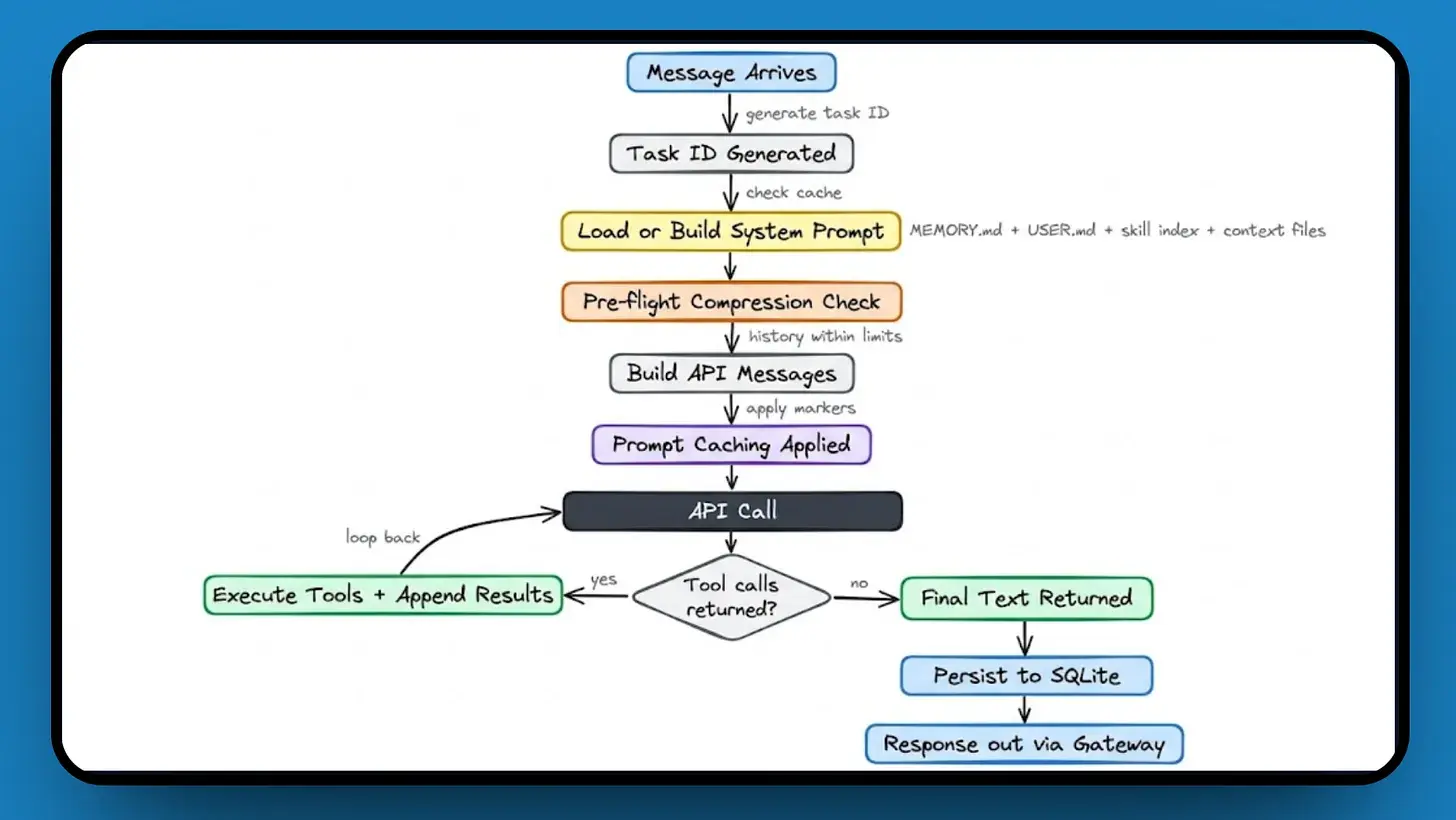 当消息到达时,Agent 会生成一个任务 ID,并加载缓存的系统提示或从内存层、技能索引和任何相关上下文文件构建一个新的提示。在 API 调用发出之前,会运行预检压缩检查,确认对话历史没有接近上下文限制。