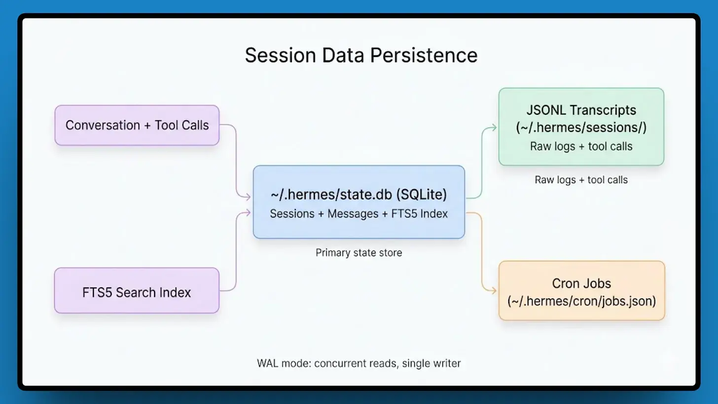 原始转录本转到 JSONL 文件,cron 定义单独存放在磁盘上,WAL 模式允许在单写入者的情况下进行并发读取,这在多个会话并行运行时保持可靠性。