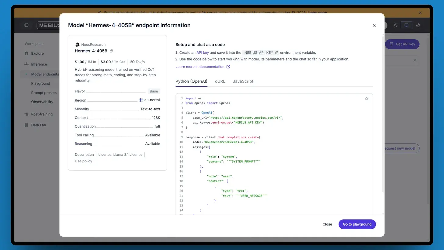 对于 Hermes Agent,你可以运行来自 Nous Research 的相同模型 Hermes-4-405B,或从 Nebius 选择其他模型,无需自己管理 GPU 配置、负载均衡或冷启动。