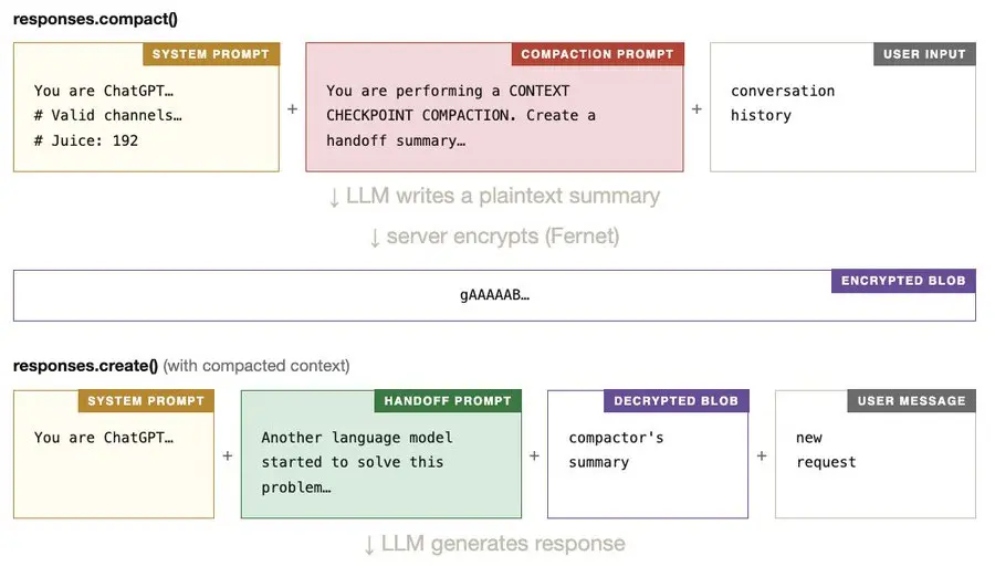 对于非 Codex 模型,开源 Codex CLI 会在本地压缩上下文:LLM 使用压缩提示符概括对话。当稍后使用压缩后的上下文时,responses.create() 会接收它,并附带一个用于构建摘要的交接提示符。这两个提示符在源代码中都可见。