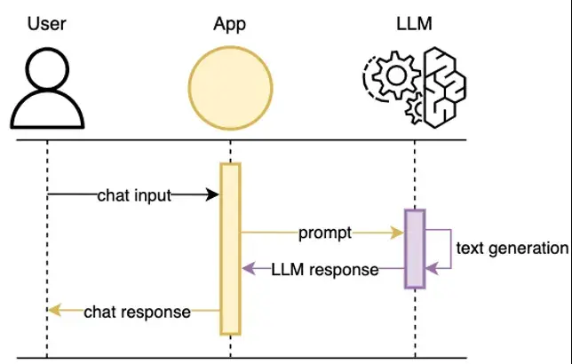 在一个典型的LLM应用中,用户的消息被发送到应用程序服务器,该服务器将其格式化为模型的提示。然后LLM生成一个响应,应用程序将该响应返回给用户。