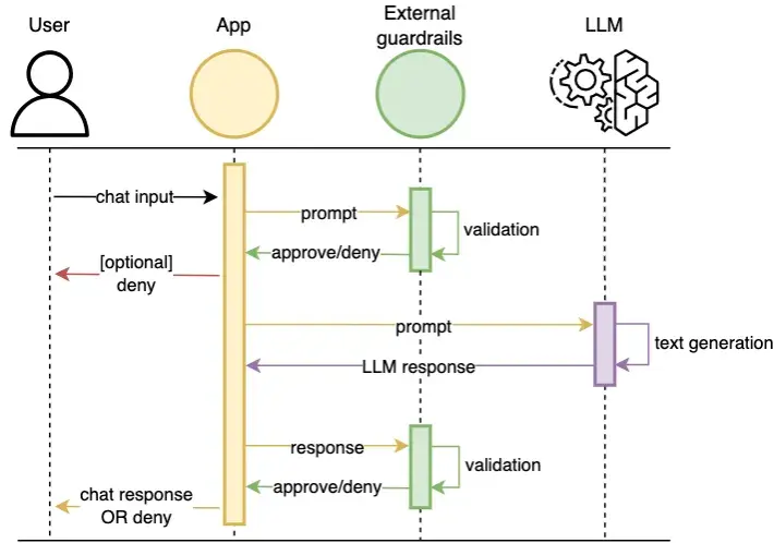 有了护栏,流程会改变。一个外部护栏模块在应用程序和LLM之间拦截请求,验证用户的输入。如果提示安全,它会继续传递给模型;如果不安全,请求会被阻止或清理。在模型响应后,输出会再次通过护栏,护栏可能会过滤或拒绝有害内容,然后再传送给用户。下图展示了这种分层流程:输入和输出分别由护栏(绿色)检查,围绕核心模型(紫色)。