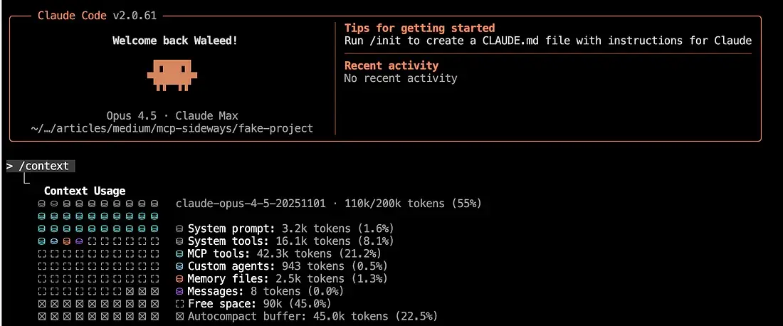 这是一个真正的“哇”时刻。我还没有给出任何指令。我的一半上下文窗口就没了?这不是说我运行了50个MCP服务器。我只是运行了两个:PAL多代理桥(一个让Claude与其他AI模型交流的工具)和Chrome DevTools用于前端测试。在我开始工作之前,我就在无形的开销上消耗了令牌。