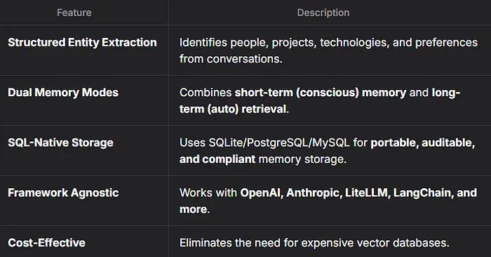 Memori 代表了 AI 系统处理记忆方式的范式转变。它利用 SQL 原生存储、双内存模式和极致的简洁性,解决了以下关键挑战: