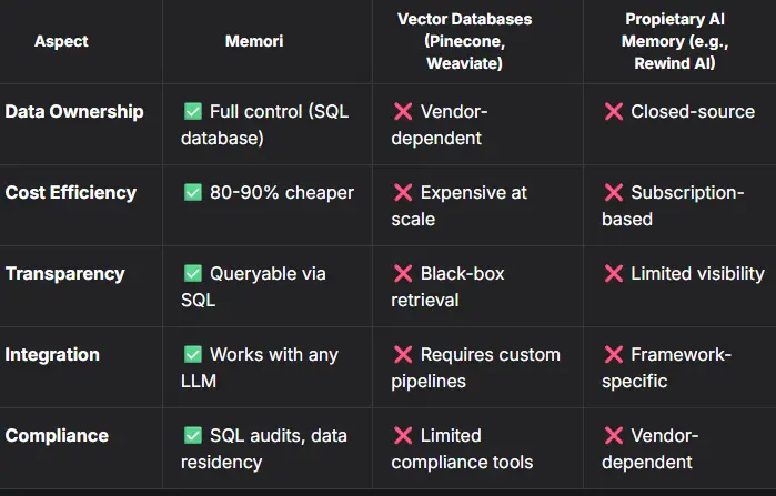 向量数据库(例如 Pinecone、Chroma)在大规模部署时成本可能非常高昂。Memori: