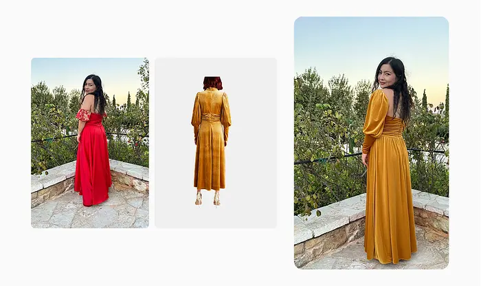 既然正面看起来还不错,我接着尝试了侧面姿势。我用了我的侧面照片和连衣裙的背面。结果:它犯了同样的错误。这次它改变了连衣裙的背面,再次被我原始服装迷惑了。不过,我仍然认为这是一个不错的结果。它帮助我看颜色是否适合我的头发和肤色,并给我一个大致的合身感觉。