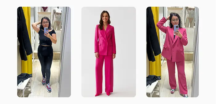 第三件我试穿的是一套西装外套和裙子,与我平时的风格非常不同。这次是Mango Outlet的一件单品。手放在心上说,感觉就像直接被传送到了商店的试衣间。我喜欢它考虑到了我的体型,所以如果我决定订购它,我会确切知道期待什么。这是一个例子,说明我可能会因为模特穿起来好看而购买某件东西,但对我来说绝对不合适。