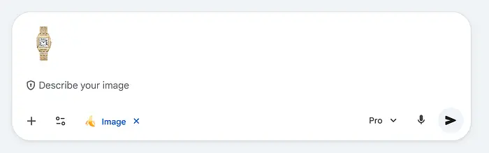 通常,我们需要在页面/屏幕上显示特定产品。对于我的示例,我将在移动端 UI 中展示豪华手表。为此,我将上传照片并要求 AI 为我生成设计。
