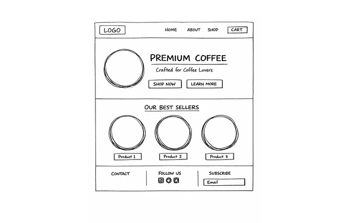 将此线框草图转换为可持续咖啡品牌的专业、高保真着陆页。
