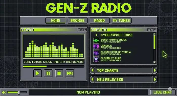 为音乐流媒体网站生成"Cyber-Y2K" 1990 年代美学的 UI 概念。