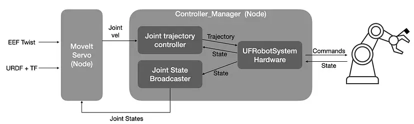 ROS2 Control的插件架构强制高级控制器与硬件接口的低级实现(例如UFRobotSystemHardware)分离。这意味着只要接口匹配,您可以用其他东西替换其中任何一个。