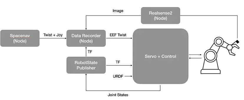 SpaceMouse的按钮和6D Twist连接到DataRecorder节点,所以我可以在基座坐标系或末端执行器坐标系速度中控制机器人,打开/关闭夹爪,以及开始/停止数据记录——这使得在短时间内记录多段数据会话变得非常容易。记录器将所有必要的主题(例如操作员命令的末端执行器Twist、相机图像、TF帧和其他一些内容)写入rosbag MCAP文件以供后续处理。