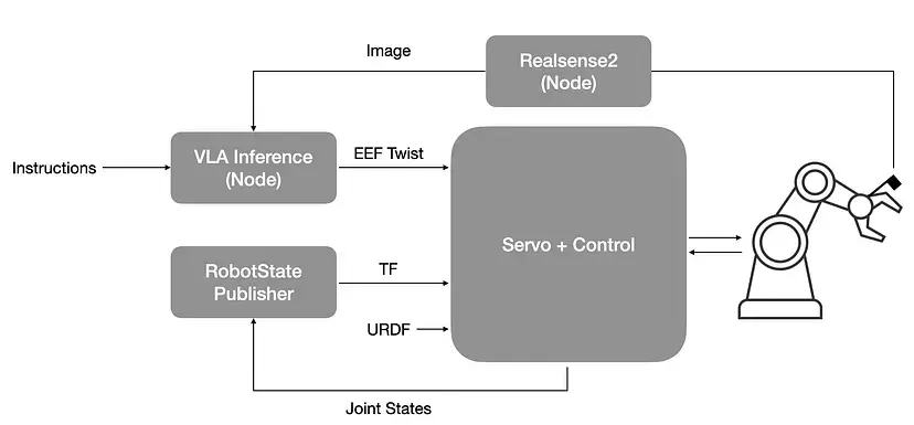 将数据收集设置更改为实时控制和推理并不复杂。所需的只是移除手动控制和记录部分,并将其替换为消耗相机图像和描述任务的文本指令的节点,并将返回的末端执行器速度注入MoveIt Servo: