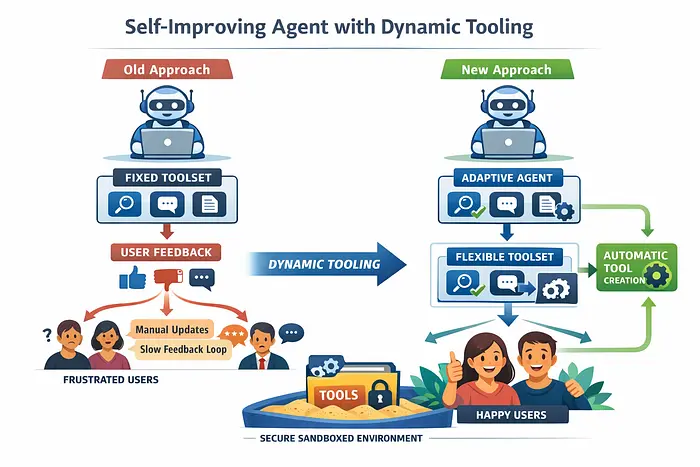 想象一下,构建一个能够处理各种任务(例如搜索、聊天、摘要等)的通用智能体。通常,这类智能体都配备了一套固定的、有限的工具。随着时间的推移,你会观察用户如何与智能体交互,并根据点赞/踩、评论或评分等反馈信号来改进工具集。
