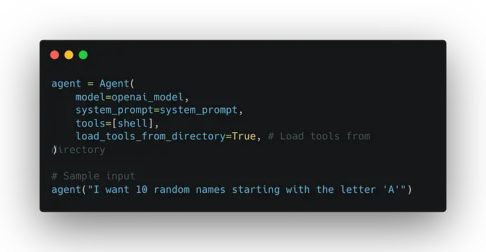 以下代理代码负责动态创建、重新加载和调用工具。创建工具目录中的文件需要 shell,因此已将其添加到工具列表中。