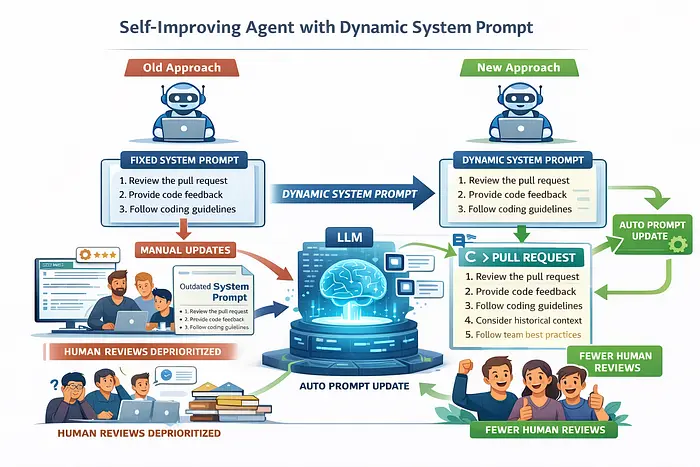 高级工程师的评审通常不仅限于代码本身,还会考虑历史背景、团队特定的编码规范、架构意图以及既定的最佳实践。理想情况下,我们希望系统能够从这些反馈中学习,从而减少重复的人工评审。但实际上,团队工作繁忙,手动更新系统提示以反映新的见解往往会被搁置,导致提示与当前预期脱节。