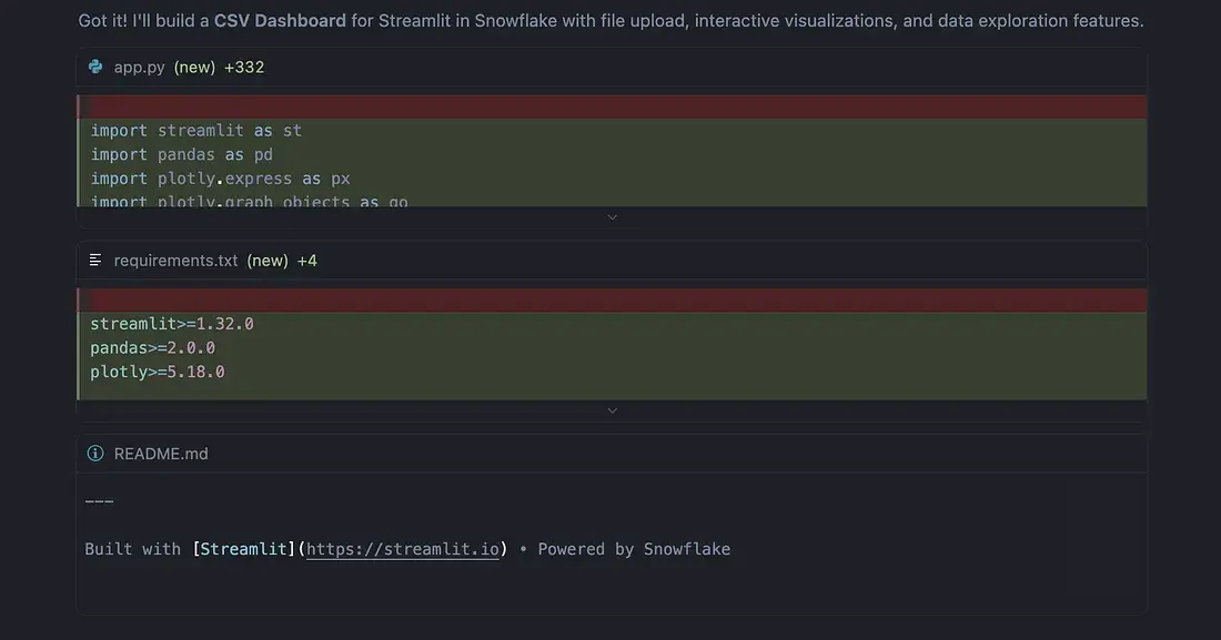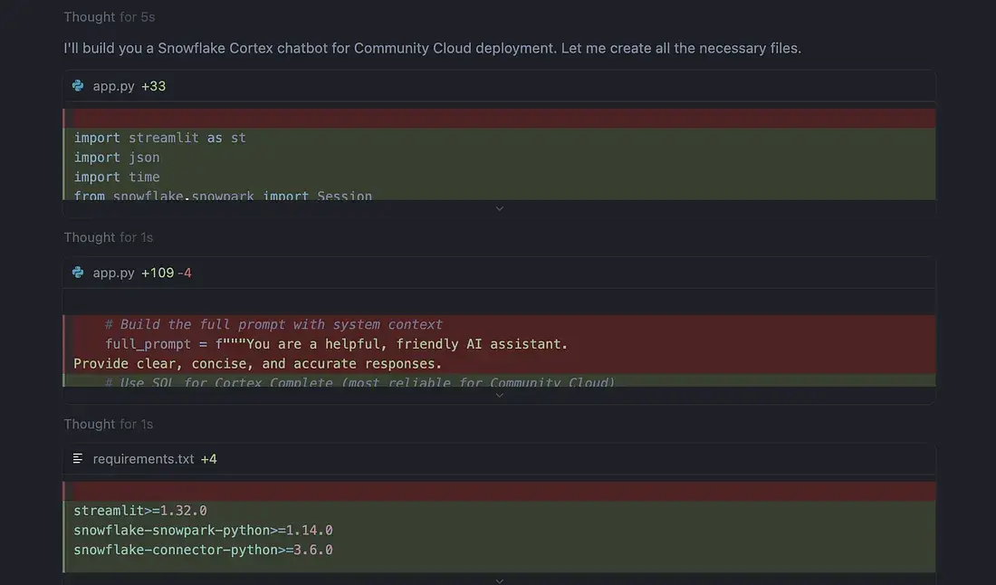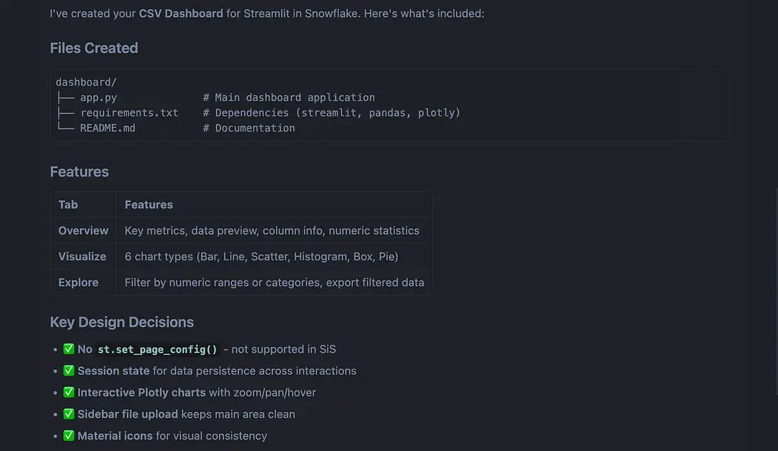 三个问题。AI 知道不问 LLM(仪表板不需要它们)并自动省略 st.set_page_config() 以实现 SiS 兼容性,因为它是 SiS 上不支持的功能。