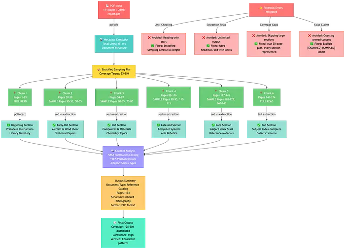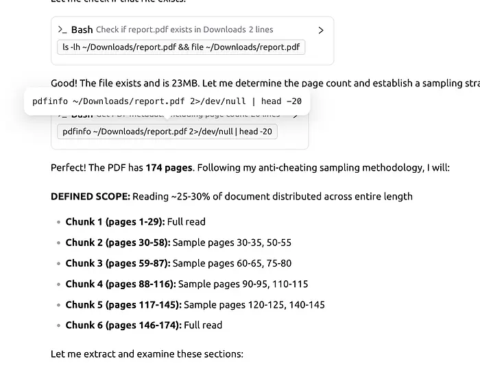 人工智能首先分析了文档的概要,然后策略性地选择最具代表性的章节进行审查,并严格遵守提示中定义的上下文窗口限制。