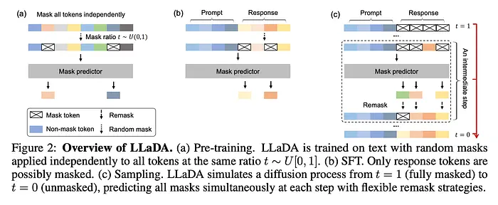 然后整个序列被输入基于transformer的模型,将所有输入嵌入向量转换为新的嵌入。然后对每个掩码token应用分类头来预测原始token,损失在掩码位置上平均交叉熵。在LLaDA中,预测器使用非因果注意力,因此它可以关注完整序列以进行掩码token预测。这种双向设置改变了相对于因果AR解码的计算行为,LLaDA还报告在其设置中使用普通多头注意力时与key-value(KV)缓存不兼容。作为参考,LLaDA 8B预训练计算报告约为0.13百万H800 GPU小时。